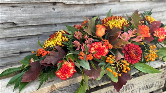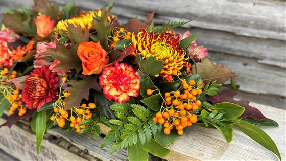 A selection of seasonal flowers in an autumnal colour palette. Please note, the flower selection may change due to seasonal availability. If there are any flowers you would like included in particular, please discuss with us.
