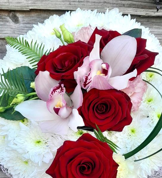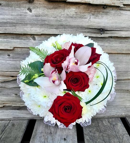 A white Chrysanthemum based posy with ribbon or foliage edge to compliment the coloured spray